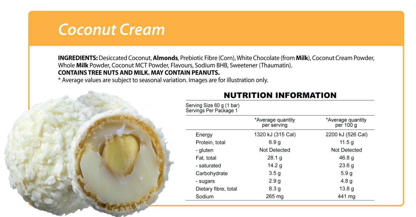 - Raw, Cold Pressed bar with MCTs & BHB + prebiotic fibre.