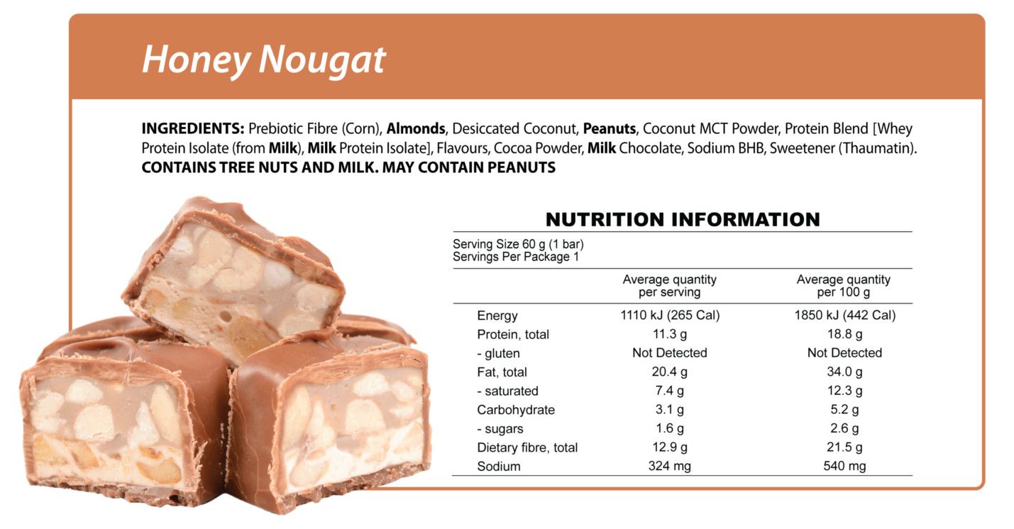 Keto Smart Bar - Honey Nougat Flavour - Visualise deliciously wicked chocolate chunks and our best vanilla nougat drenched in golden honey, enrobed in peanuts.