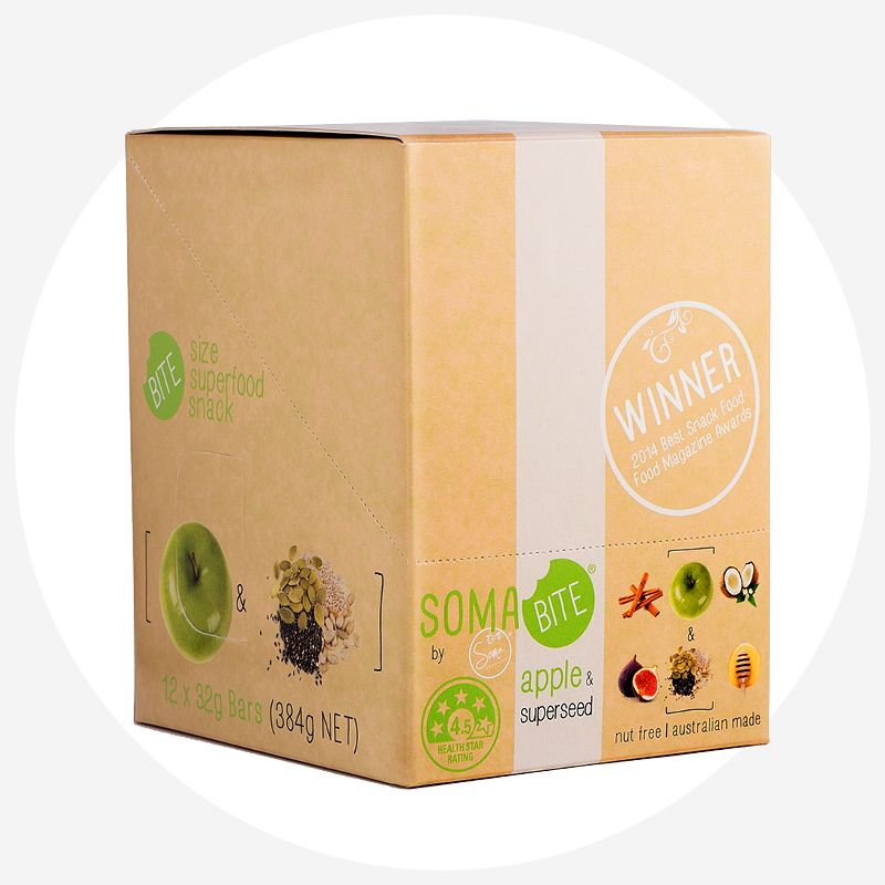 Soma Bite Apple & Superseed - The award-winning bite-size superfood snack. Only whole, natural ingredients. A bite size superfood snack packed with wholesome, nutritional ingredients. A fusion of premium nuts, berries, superfoods and seeds cold-pressed to ensure optimal purity of each ingredient is sustained. Read more