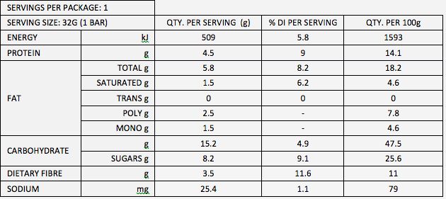 Seeds (chia, pumpkin, sesame) 29.4%, figs, rice malt syrup, apple (12.3%), currants, pea protein, buckwheat flour, coconut oil, cinnamon, clove, rosemary extract… and that’s how we roll.