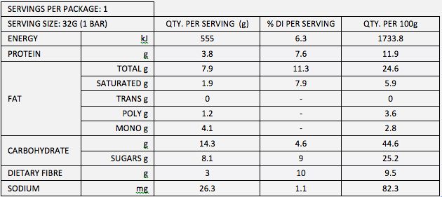 figs (41%) cashews, almonds, macadamias, pea protein, coconut (oil & flour), lemon myrtle blend (0.5%), orange juice concentrate, kakadu plum, rosemary extract, himalayan salt… and that’s how we roll.
