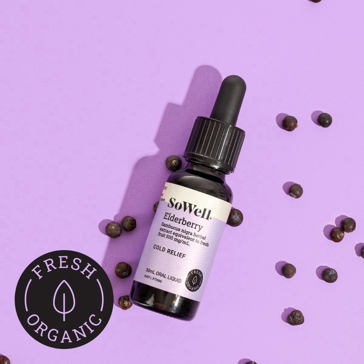 SoWell's seed to bottle herbal extraction process commences within 24 hours of the Sambucus nigra being harvested, capturing the fresh fruit active medicinal constituents in a concentrated oral liquid form, size 30ml.