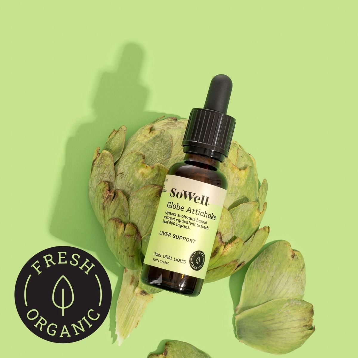 SoWell's seed to bottle herbal extraction process commences within 24 hours of the Cynara scolymus being harvested, capturing the fresh leaf active medicinal constituents in a concentrated oral liquid form, size 30ml.