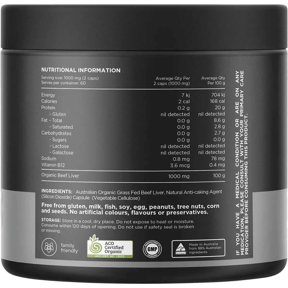 Australian Organic Grass Fed Beef Liver, Natural Anti-Caking Agent (Silicon Dioxide), Capsule (Vegetable Cellulose)