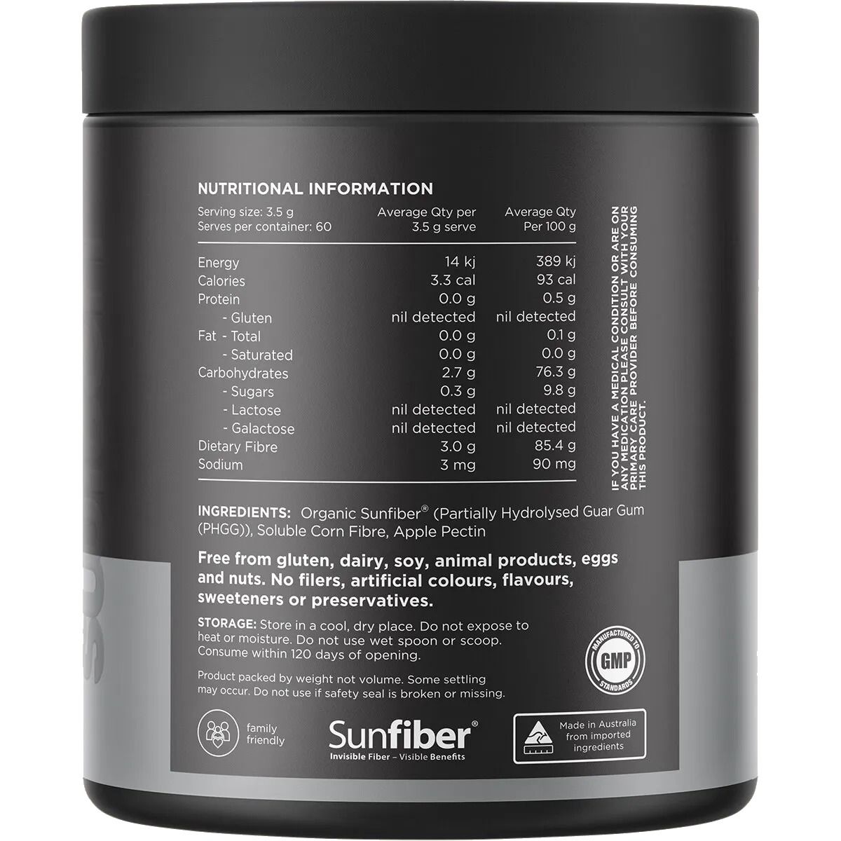 Organic Sunfiber (Partially Hydrolysed Guar Gum (PHGG)), Soluble Corn Fibre, Apple Pectin.