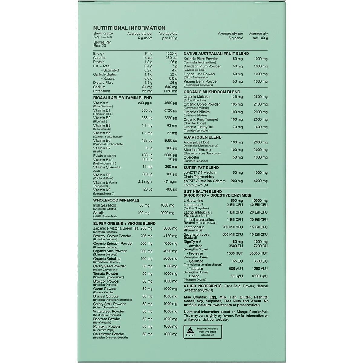 Super Greens & Vege Blend Japanese Matcha Green Tea, Broccoli Sprout Extract, Organic Spinach Powder, Organic Kale Powder, Organic Spirulina, Celery Seed Powder, Tomato Powder, Broccoli Powder, Carrot Powder, Brussels Sprouts Powder, Celery Stalk Powder, Watercress Powder, Beetroot Powder, Pumpkin Powder, Cauliflower Powder, Organic Mushroom Blend (Organic Maitake Mushroom, Organic Cordyceps Militaris, Organic Shiitake Mushroom, Organic King Trumpet Mushroom, Organic Turkey Tail Mushroom), Gut Health Blend L-Glutamine, Digezyme® (Amylase, Protease, Cellulase, Tilactase, Lipase), Lactospore® (Bacillus Coagulans), Lactiplantibacillus Plantarum, Limosilactobacillus Reuteri, Lactobacillus Rhamnosus, Saccharomyces Boulardii), Flavour, Citric Acid, Adaptogen Blend (Astragalus Root, Siberian Ginseng, Quercetin) Super Fat Blend (Gofat® Australian Cobram Estate Olive Oil GoMTC® C8 Medium Chain Triglycerides), Native Australian Fruit Blend (Kakadu Plum Powder, Davidson Plum Powder, Finger Lime Powder, Pepper Berry Powder), Bioavailable Vitamin Blend (Vitamin C (Ascorbic Acid), Vitamin E (Dl-Alpha Tocopherol), Vitamin B3 (Niacinamide), Vitamin B5 (Pantothenic Acid), Vitamin B6 (Pyridoxal 5-Phosphate), Vitamin B2 (Riboflavin), Vitamin B1 (Thiamin), Vitamin A (Beta Carotene), Vitamin K2 (Menaquinone-7), Vitamin D3 (Cholecalciferol), Vitamin B7 (Biotin), Folate (5-Mthf), Vitamin B12 (Methyl cobalamin)), Wholefood Mineral Blend (Organic Himalayan Shilajit (=50% Fulvic Acid, Irish Sea Moss), Natural Sweetener (Stevia).
