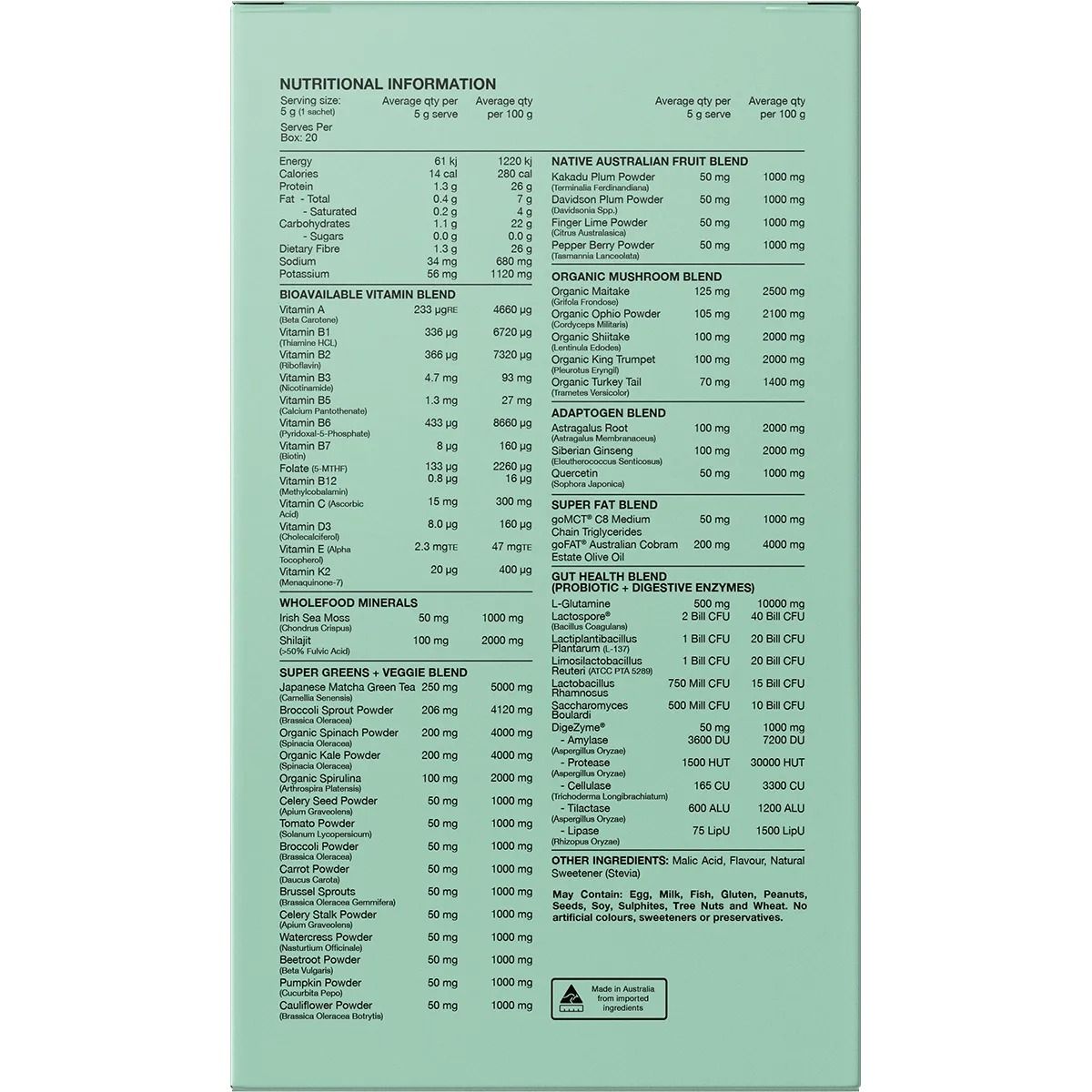Super Greens & Vege Blend Japanese Matcha Green Tea, Broccoli Sprout Extract, Organic Spinach Powder, Organic Kale Powder, Organic Spirulina, Celery Seed Powder, Tomato Powder, Broccoli Powder, Carrot Powder, Brussels Sprouts Powder, Celery Stalk Powder, Watercress Powder, Beetroot Powder, Pumpkin Powder, Cauliflower Powder, Organic Mushroom Blend (Organic Maitake Mushroom, Organic Cordyceps Militaris, Organic Shiitake Mushroom, Organic King Trumpet Mushroom, Organic Turkey Tail Mushroom), Gut Health Blend L-Glutamine, Digezyme® (Amylase, Protease, Cellulase, Tilactase, Lipase), Lactospore® (Bacillus Coagulans), Lactiplantibacillus Plantarum, Limosilactobacillus Reuteri, Lactobacillus Rhamnosus, Saccharomyces Boulardii), Flavour, Malic Acid, Adaptogen Blend (Astragalus Root, Siberian Ginseng, Quercetin) Super Fat Blend (Gofat® Australian Cobram Estate Olive Oil GoMTC® C8 Medium Chain Triglycerides), Native Australian Fruit Blend (Kakadu Plum Powder, Davidson Plum Powder, Finger Lime Powder, Pepper Berry Powder), Bioavailable Vitamin Blend (Vitamin C (Ascorbic Acid), Vitamin E (Dl-Alpha Tocopherol), Vitamin B3 (Niacinamide), Vitamin B5 (Pantothenic Acid), Vitamin B6 (Pyridoxal 5-Phosphate), Vitamin B2 (Riboflavin), Vitamin B1 (Thiamin), Vitamin A (Beta Carotene), Vitamin K2 (Menaquinone-7), Vitamin D3 (Cholecalciferol), Vitamin B7 (Biotin), Folate (5-Mthf), Vitamin B12 (Methyl cobalamin)), Wholefood Mineral Blend (Organic Himalayan Shilajit (=50% Fulvic Acid, Irish Sea Moss), Natural Sweetener (Stevia).