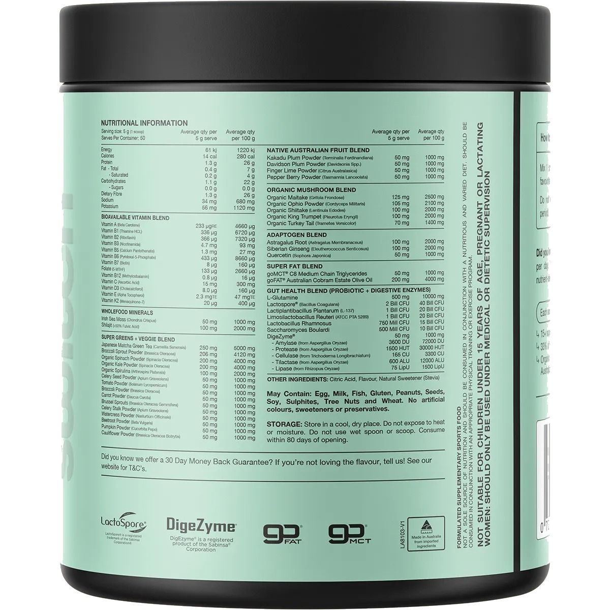 Super Greens & Vege Blend Japanese Matcha Green Tea, Broccoli Sprout Extract, Organic Spinach Powder, Organic Kale Powder, Organic Spirulina, Celery Seed Powder, Tomato Powder, Broccoli Powder, Carrot Powder, Brussels Sprouts Powder, Celery Stalk Powder, Watercress Powder, Beetroot Powder, Pumpkin Powder, Cauliflower Powder, Organic Mushroom Blend (Organic Maitake Mushroom, Organic Cordyceps Militaris, Organic Shiitake Mushroom, Organic King Trumpet Mushroom, Organic Turkey Tail Mushroom), Gut Health Blend L-Glutamine, Digezyme® (Amylase, Protease, Cellulase, Tilactase, Lipase), Lactospore® (Bacillus Coagulans), Lactiplantibacillus Plantarum, Limosilactobacillus Reuteri, Lactobacillus Rhamnosus, Saccharomyces Boulardii), Flavour, Citric Acid, Adaptogen Blend (Astragalus Root, Siberian Ginseng, Quercetin) Super Fat Blend (Gofat® Australian Cobram Estate Olive Oil GoMTC® C8 Medium Chain Triglycerides), Native Australian Fruit Blend (Kakadu Plum Powder, Davidson Plum Powder, Finger Lime Powder, Pepper Berry Powder), Bioavailable Vitamin Blend (Vitamin C (Ascorbic Acid), Vitamin E (Dl-Alpha Tocopherol), Vitamin B3 (Niacinamide), Vitamin B5 (Pantothenic Acid), Vitamin B6 (Pyridoxal 5-Phosphate), Vitamin B2 (Riboflavin), Vitamin B1 (Thiamin), Vitamin A (Beta Carotene), Vitamin K2 (Menaquinone-7), Vitamin D3 (Cholecalciferol), Vitamin B7 (Biotin), Folate (5-Mthf), Vitamin B12 (Methyl cobalamin)), Wholefood Mineral Blend (Organic Himalayan Shilajit (=50% Fulvic Acid, Irish Sea Moss), Natural Sweetener (Stevia).