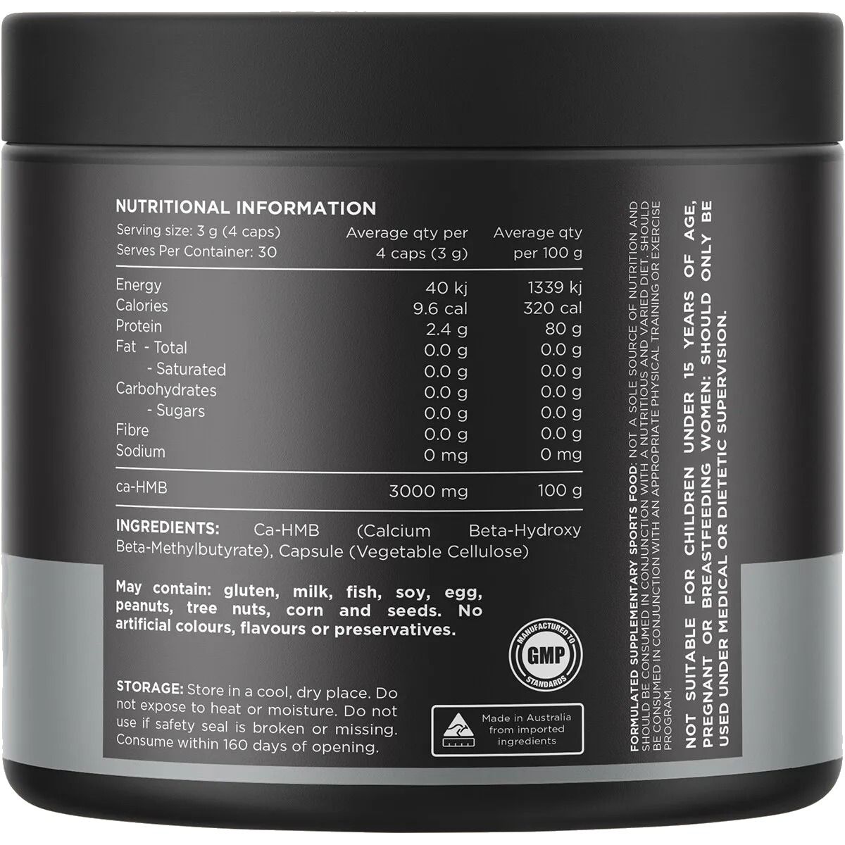 Ca-HMB (Calcium Beta-Hydroxy Beta-Methylbutyrate), Natural Anti-Caking Agent (Silicon Dioxide), Capsule (Vegetable Cellulose)