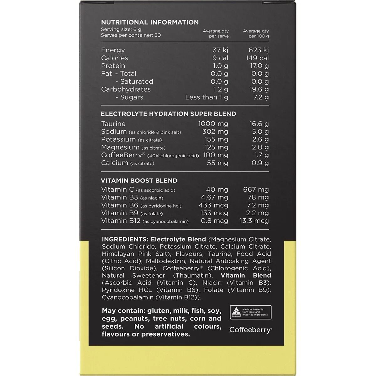 Electrolyte Blend (Magnesium Citrate, Sodium Chloride, Potassium Citrate, Calcium Citrate, Himalayan Pink Salt), Taurine, Flavours, Coffee Berry Extract (Chlorogenic Acid), Food Acid (Citric Acid), Maltodextrin (Corn), Natural Anticaking Agent (Silicon Dioxide), Ascorbic Acid (Vitamin C), Natural Sweetener (Thaumatin), Niacin (Vitamin B3), Pyridoxine HCL (Vitamin B6), Folate (Folic Acid), Cynocobalamin (Vitamin B12).