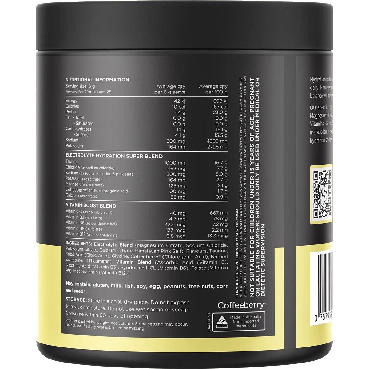Electrolyte Blend (Magnesium Citrate, Sodium Chloride, Potassium Citrate, Calcium Citrate, Himalayan Pink Salt), Flavours, Taurine, Food Acid (Citric Acid), Glycine, Coffeeberry (Chlorogenic Acid), Natural Sweetener (Thaumatin), Vitamin Blend (Ascorbic Acid (Vitamin C), Niacin (Vitamin B3), Pyridoxine Hcl (Vitamin B6), Folate (Vitamin B9), Mecobalamin (Vitamin B12).