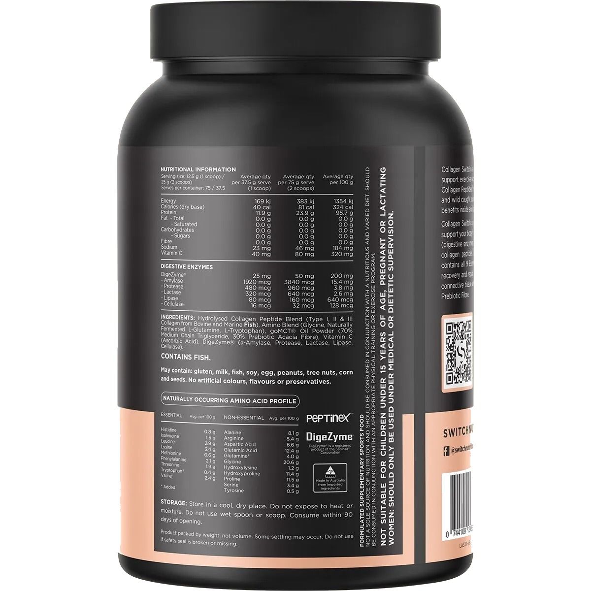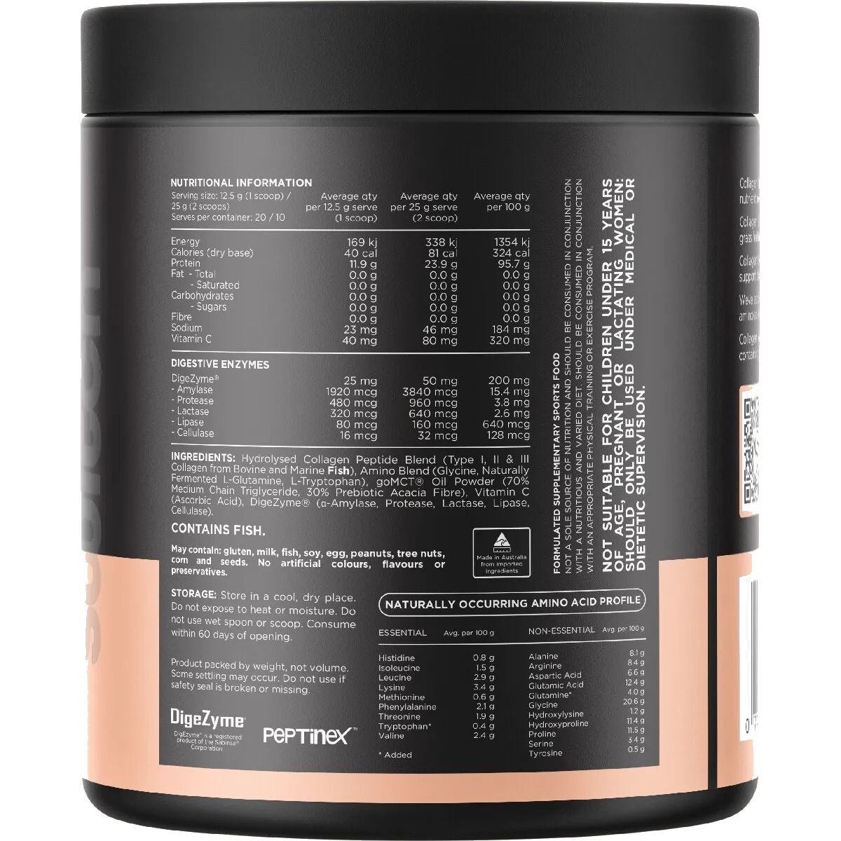 Hydrolysed Collagen Peptide Blend (Type I, II & III Collagen from Bovine and Marine (Fish)), Amino Blend (Glycine, Naturally Fermented L-Glutamine, L-Tryptophan), goMCT® Oil Powder (70% Medium Chain Triglyceride, 30% Prebiotic Acacia Fibre), Flavours, Natural Thiickener (Guar Gum), Vitamin C (Ascorbic Acid), DigeZyme® (a-Amylase, Protease, Lactase, Lipase, Cellulase).