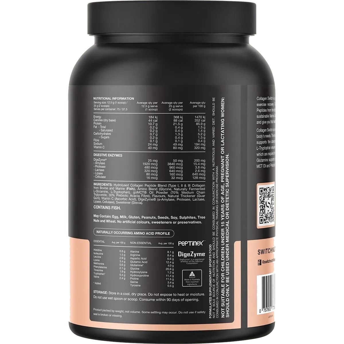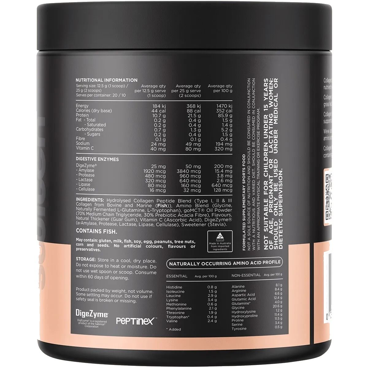 Hydrolysed Collagen Peptide Blend (Type I, II & III Collagen from Bovine and Marine (Fish)), Amino Blend (Glycine, Naturally Fermented L-Glutamine, L-Tryptophan), goMCT® Oil Powder (70% Medium Chain Triglyceride, 30% Prebiotic Acacia Fibre), Flavours, Natural Thickener (Guar Gum), Vitamin C (Ascorbic Acid), DigeZyme® (a-Amylase, Protease, Lactase, Lipase, Cellulase), Sweetener (Stevia).