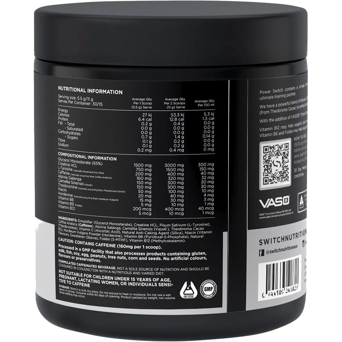 Emulsifier (Glycerol Monostearate), Creatine HCL, Pisum Sativum (L-Tyrosine), Coffea Arabica (Caffeine), Alpinia Galanga, Camellia Sinensis (Vaso6®), Theobroma Cacao (Theobromine), Vitamin C (Ascorbic Acid), Natural Anti-Caking Agent (Silica), Niacin (Vitamin B3), Hordeum Vulgare Powder (Hordenine), Vitamin B6 (Pyridoxal-5-Phosphate), Natural Flavours, Sweetener (Stevia), Folate (5-MTHF), Vitamin B12 (Methylcobalamin).