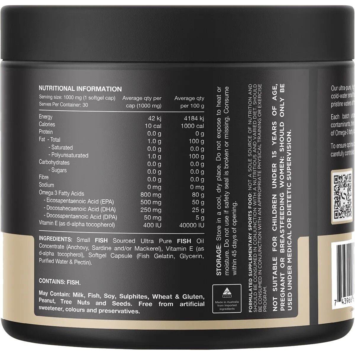 Small Fish Sourced Ultra Pure Fish Oil Concentrate (Anchovy, Sardine And/Or Mackrel), Vitamin E (As D-Alpha Tocopherol), Sofgel Capsule (Fish Gelatin, Glycerin, Purified Water & Pectin).