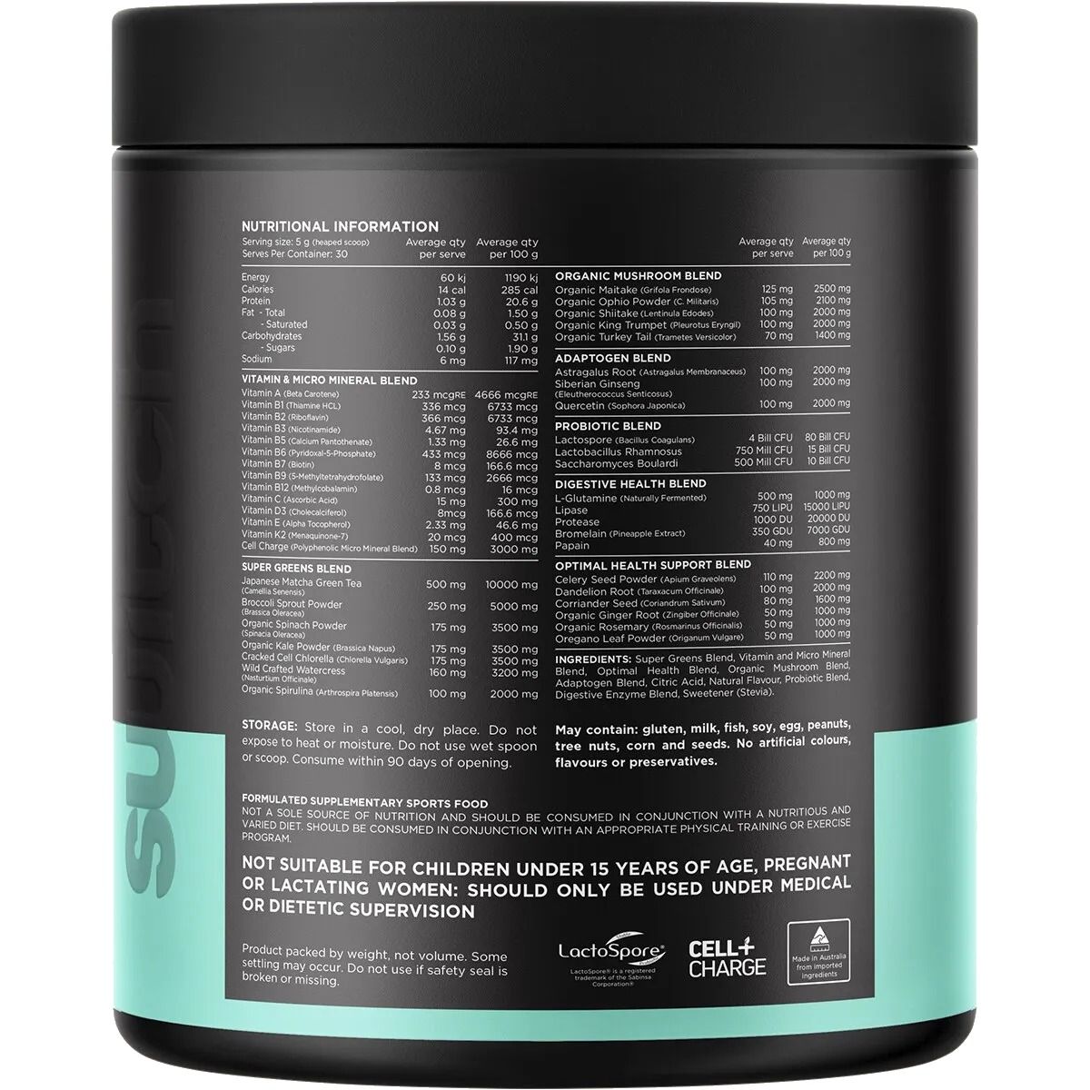 Super Greens Blend (Japanese Matcha Green Tea (Camellia Sinensis), Broccoli Sprout Powder (Brassica Oleracea), Organic Spinach Powder (Spinacia Oleracea), Organic Kale Powder (Brassica Napus), Cracked Cell Chlorella (Chlorella Vulgaris), Wild Crafted Watercress (Nasturtium Officinale), Organic Spirulina (Arthrospira Platensis), Vitamin and Micro Mineral Blend (Vitamin A (Beta Carotene) Vitamin B1 (Thiamine HCL), Vitamin B2 (Riboflavin), Vitamin B3 (Nicotinamide), Vitamin B5 (Calcium Pantothenate), Vitamin B6 (Pyridoxal-5-Phosphate), Vitamin B7 (Biotin), Vitamin B9 (S-Methyltetrahydrafolate), Vitamin B12 (Methylcobalamin), Vitamin C (Ascorbic Acid), Vitamin D3 (Cholecalciferol), Vitamin E (Alpha Tocopherol), Vitamin K2 (Menaquinone-7), Cell Charge (Polyphenolic Micro Mineral Blend)), Optimal Health Blend (Celery Seed Powder (Apium Graveolens), Dandelion Root (Taraxacum Officinale), Coriander Seed (Coriandrum Sativum), Organic Ginger Root (Zingiber Officinale) Organic Rosemary (Rosmarinus Officinalis), Oregano Leaf Powder (Origanum Vulgare)), Organic Mushroom Blend (Organic Maitake (Grifols Frondose) Organic Ophio Powder (c. Militaris), Organic Shiitake (Lentinula Edodes), Organic King Trumpet (Pleurotus Eryngil), Organic Turkey Tail (Trametes Versicolor)), Adaptogen Blend (Astragalus Root (Astragalus Membranaceus), Siberian Ginseng (Eleutherococcus Senticosus), Quercetin (Sophora Japonica)), Thickener (Naturally Fermented L-Glutamine 500mg), Citric Acid, Natural Flavour, Probiotic Blend (Lactospore (Bacillus Coagulans), Lactobacillus Rhamnosus, Saccharomyces Boulardi), Digestive Enzyme Blend (Lipase, Protease, Bromelain (Pineapple Extract), Papain), Sweetener (Stevia).