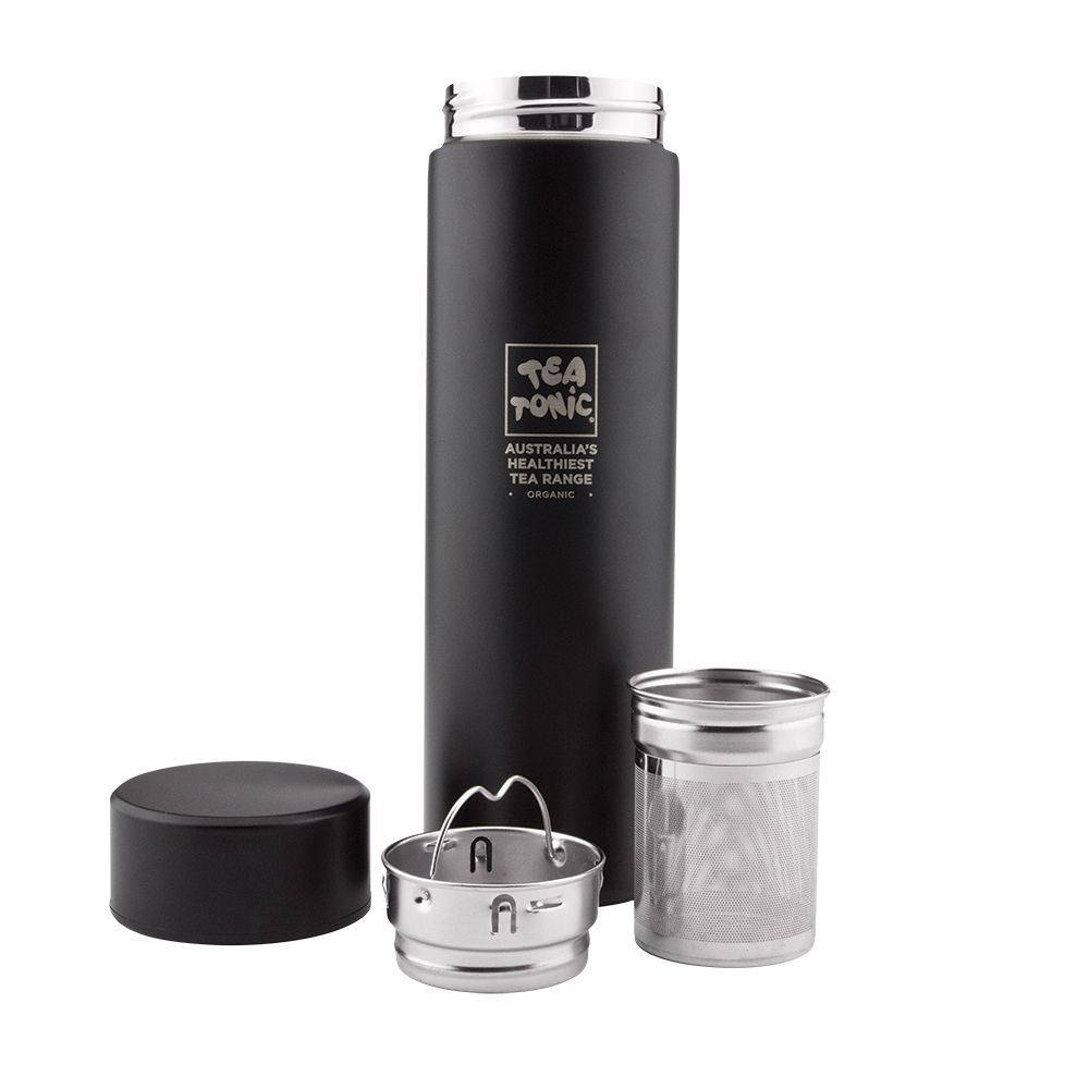 This slim line, sleek, double walled stainless steel Tea Bottle, makes drinking loose leaf tea easy. Simply add your favourite Tea Tonic loose leaf tea into the infuser basket, fasten the basket into position inside the thermos, fill with hot or chilled water and once your tea is brewed you can drink from the thermos bottle on-the- go wherever you should wander. Read more