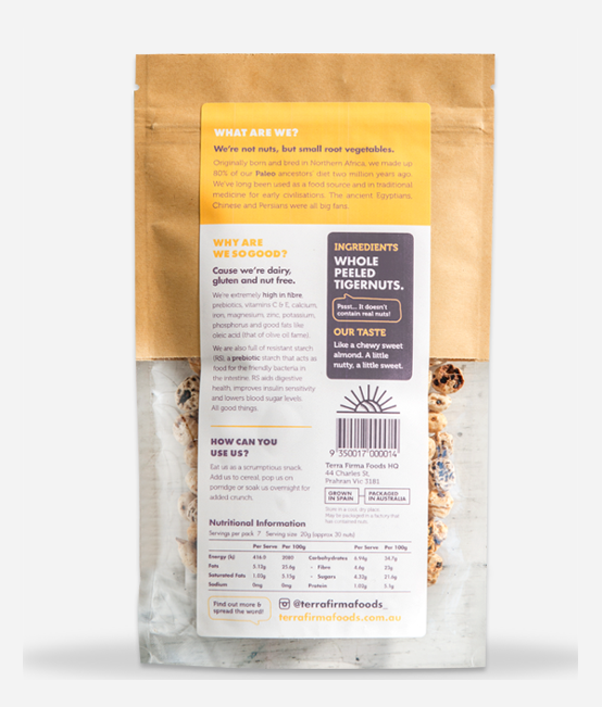 Tigernuts are not nuts, they are a root vegetable from the Tuber family. Whilst Terra Firma take the utmost care to ensure their product is packaged in a nut-free environment, there is a chance that Terra Firma Foods Tigernuts and Tigernut Flour contain almonds and traces of peanuts due to the environment in which they are packaged.