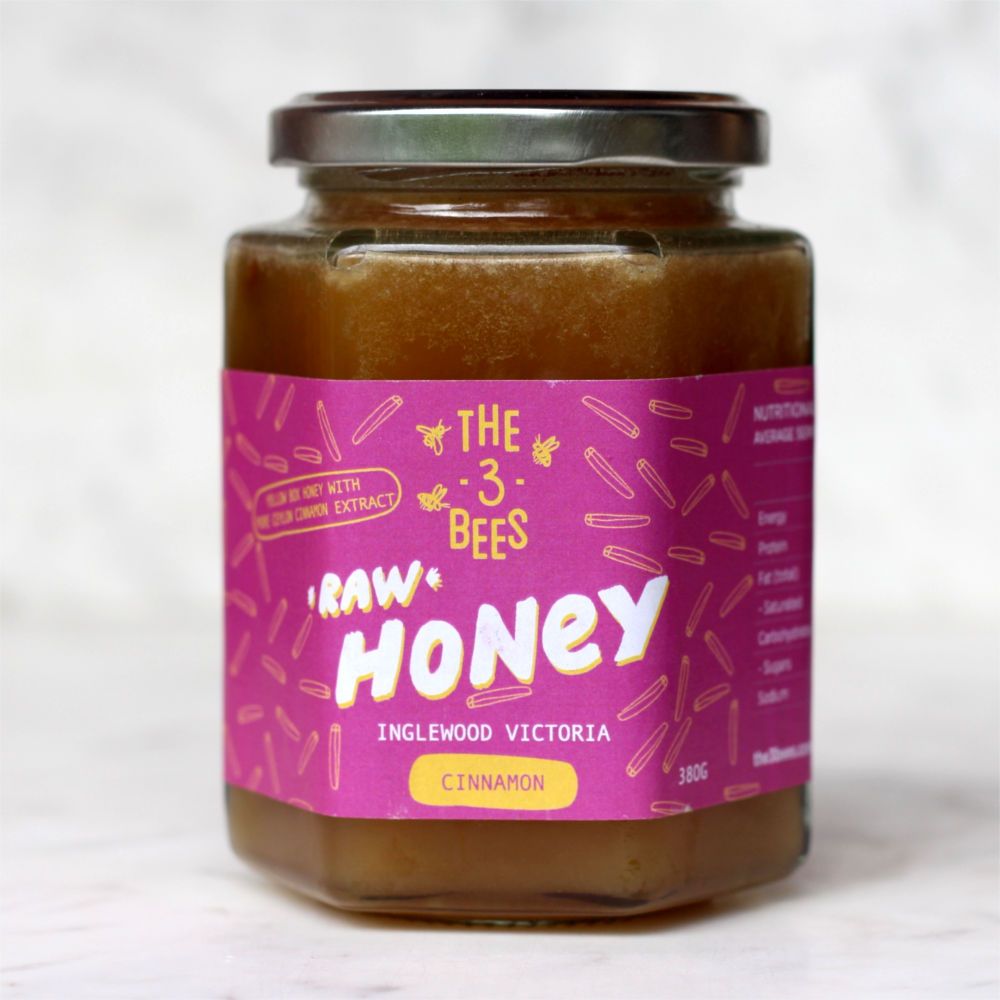 The 3 Bees Cinnamon honey is made using raw Yellow box honey with the addition of pure Ceylon Cinnamon extract and a Cinnamon stick.