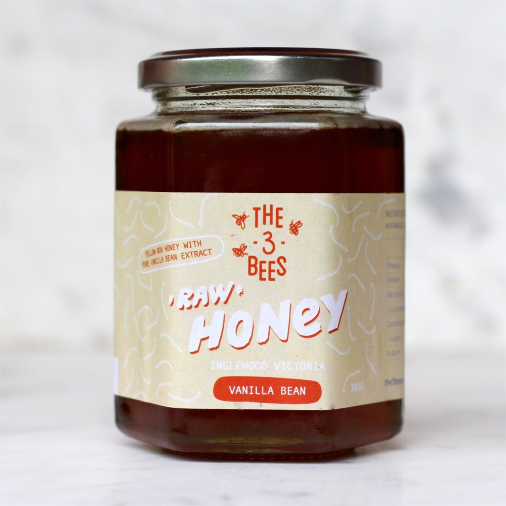 The 3 Bees Vanilla Honey is made using raw Yellowbox honey with the addition of pure vanilla extract and a vanilla bean.
