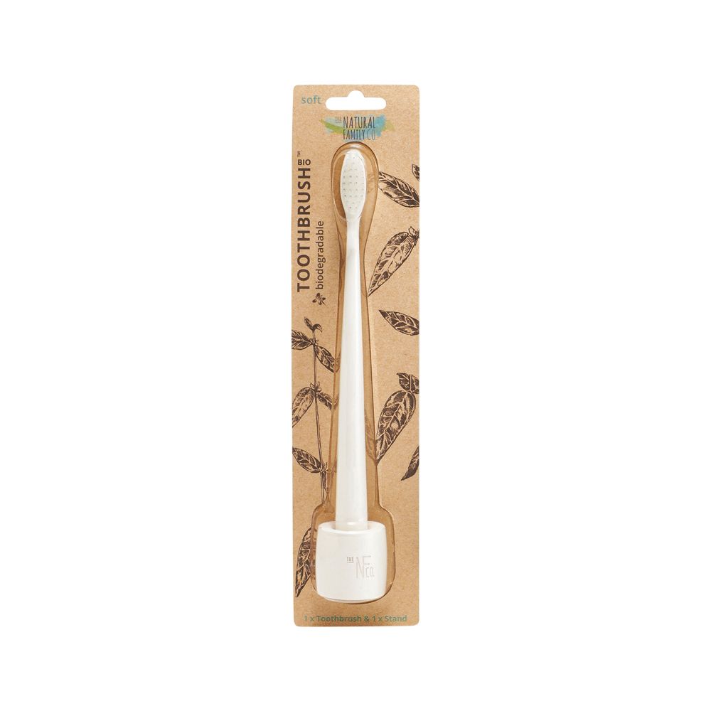 The NFco Bio Toothbrush is biodegradable along with its packaging. The handle is made from non-GMO cornstarch with nylon bristles which are BPA free.