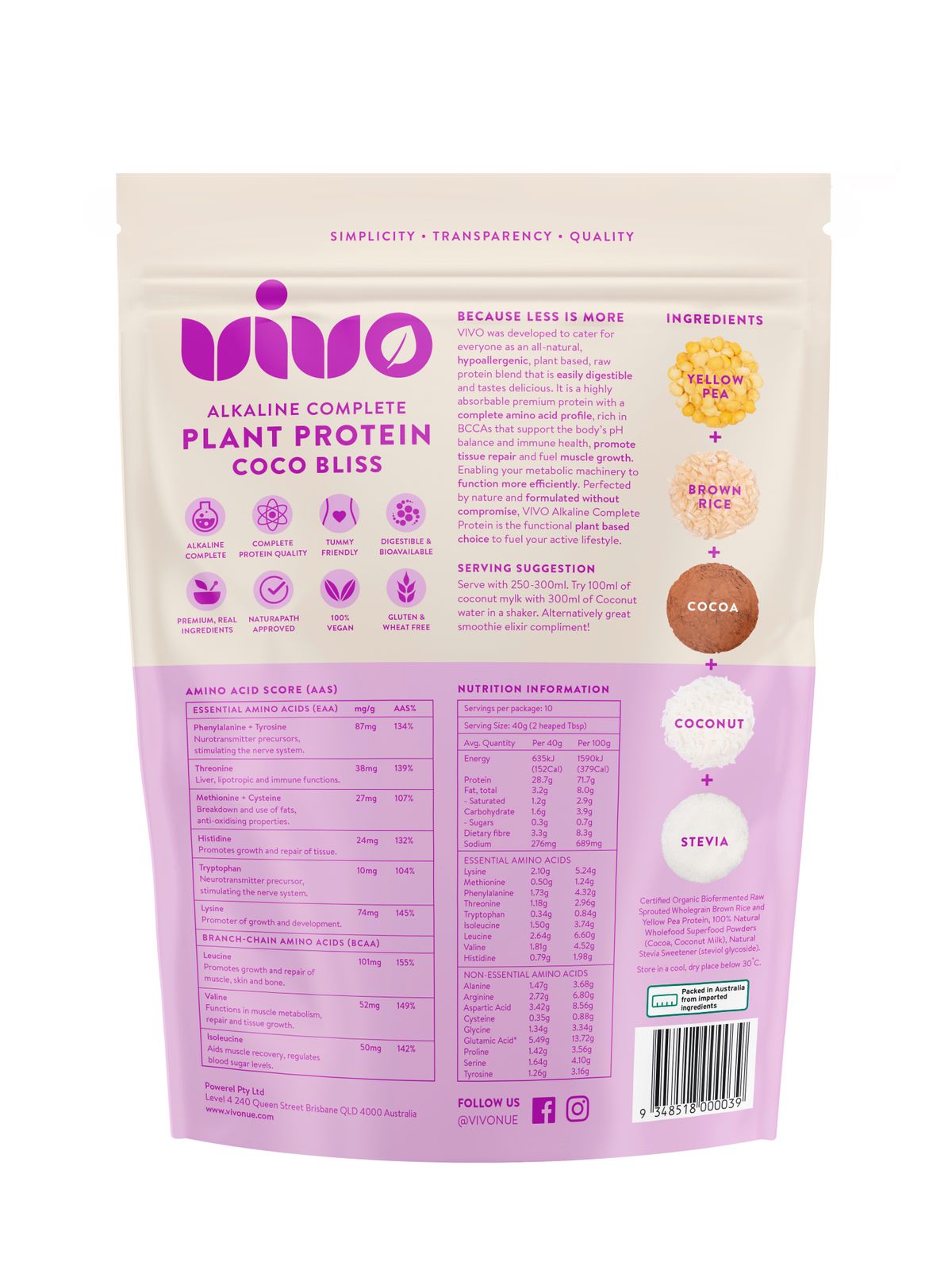 Certified Organic Biofermented Raw Sprouted Wholegrain Brown Rice and Yellow Pea Protein, 100% Natural Wholefood Superfood Powders (Cacao, Coconut Milk), Natural Stevia Sweetener (steviol glycoside).