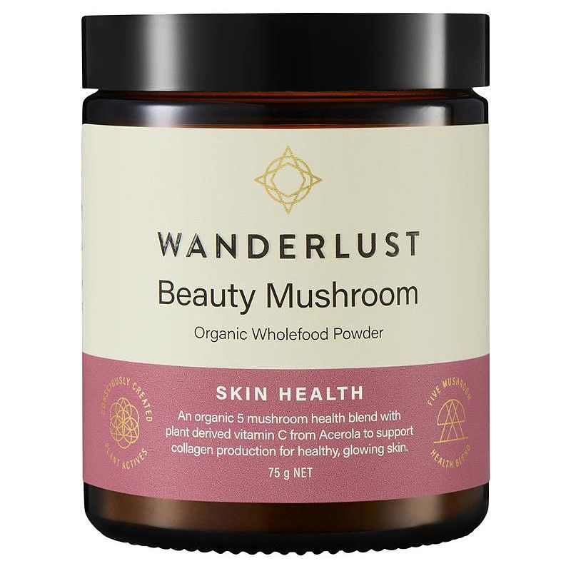 Wanderlust Beauty Mushroom is an organic 5 mushroom health blend with plant derived vitamin C from Acerola to support collagen production for healthy, glowing skin.
