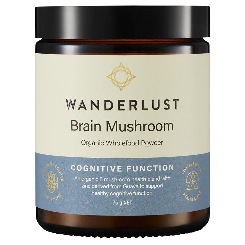 Wanderlust Brain Mushroom is a consciously created organic five mushroom, wholefood health blend, with zinc derived from Guava to support brain health by maintaining healthy cognitive function.