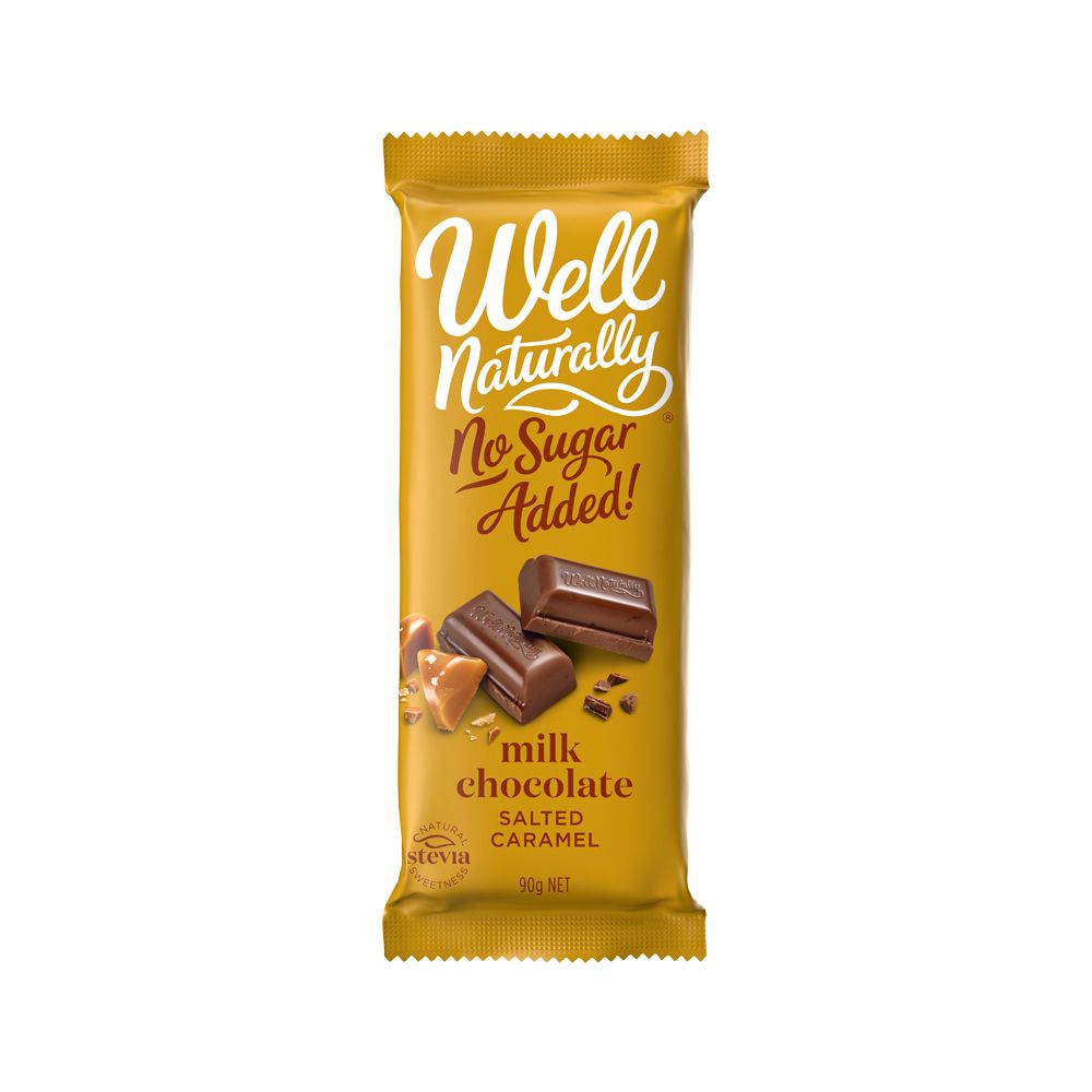 Well Naturally Milk Chocolate Salted Caramel is a 90g moulded block of no sugar added milk chocolate containing 34% cocoa solids and 24% milk solids with 10% salted caramel pieces and natural flavours.