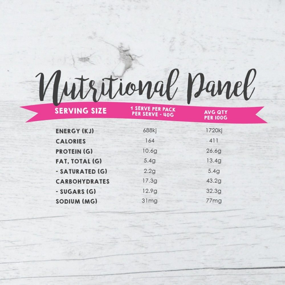 Dark chocolate, whey protein isolate, gluten free flour, apricots, dates, sultanas, peanuts, oil.