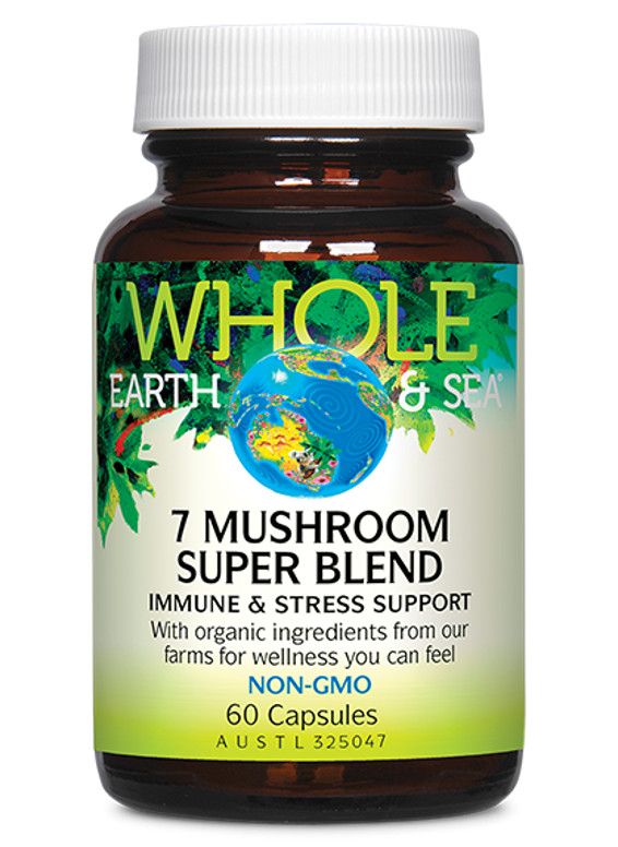 Whole Earth & Sea 7 Mushroom Super Blend is a blend of seven organic mushroom superfoods – maitake, shiitake, reishi, cordyceps, zhuling, silver ear, and Wolfiporia cocos , as well as Wellmune® beta glucans and our own Farm Fresh FactorsTM for an immune and stress support formula charged with the vibrant energy and goodness of nature. Read more