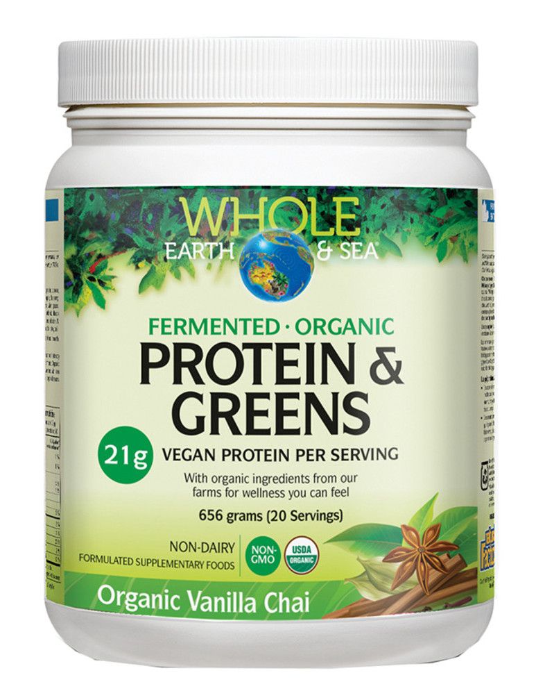 Whole Earth & Sea Protein & Greens | Vanilla Chai - Fermented, Organic Protein & Greens is a vegan-friendly, dairy free and non-GMO formula, sweetened with low glycaemic stevia and only contains natural certified organic flavours. This innovative formula goes beyond standard greens or protein powders, providing a naturally concentrated source of quality protein and highly bioavailable nutrients to support your active lifestyle.