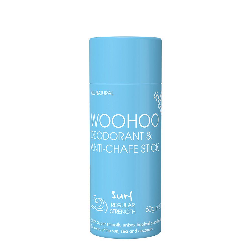 Woohoo Surf is tropical island armpit bliss. The subtle yet irresistible unisex aroma and smooth and creamy formula will have you dreaming of surf and sunsets. Count on it to protect you from body odour all day and well past cocktail hour. It's free from essential oils, pH-adjusted to be gentle on your skin, and lives in an earth-friendly biodegradable cardboard tube. Like all of our sticks, Surf is easy to apply and protects you from body odour and chafe all day, and then some. Aluminium free, plastic free deodorant bliss - here you come! If you experience rubbing, chafing and discomfort from skin-on-skin or skin-on-clothing, a Woohoo stick can help. Between your thighs (“chub rub”), under your breasts, arms, legs - just lightly apply Woohoo stick to reduce the friction.