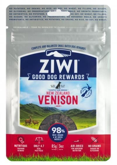 he Ziwi Venison Good Dog Rewards contain 98% premium New Zealand Venison meat, including tripe, and Green Mussels. ZiwiPeak Rewards are slowly and gently air-dried to preserve the best of our special New Zealand ingredients.